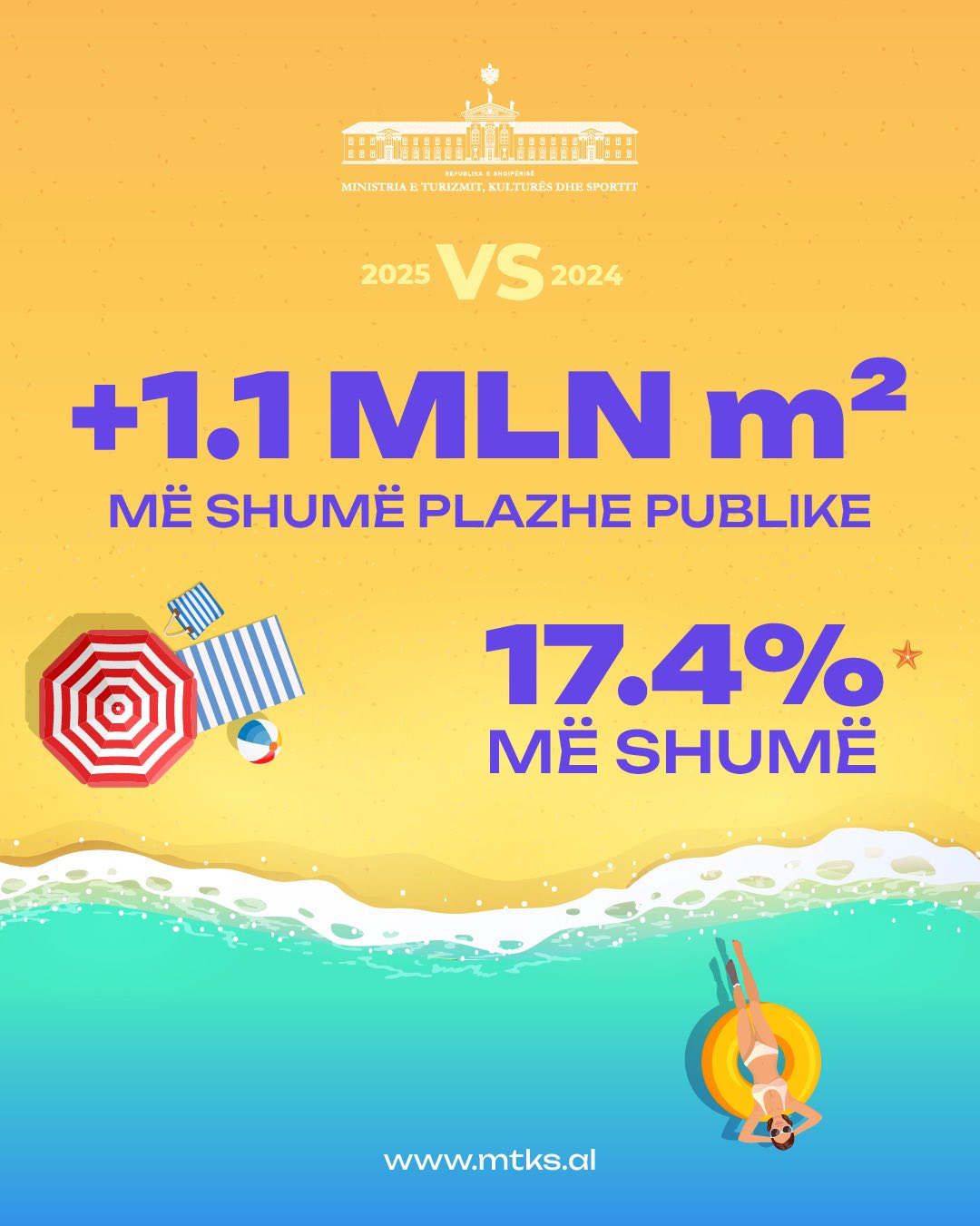 Krahasuar me vitin 2024, plazhet publike janë rritur me +17.4%, duke shtuar mbi 1.1 milion m² sipërfaqe të aksesueshme për qytetarët.